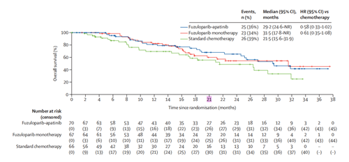 在OS方面,与医生选择标准化疗相比,氟唑帕利联合阿帕替尼治疗以及氟唑帕利单药治疗均观察到了OS的获益趋势,OS数据尚不成熟,后续随访会进一步完善OS数据。OS结果显示: