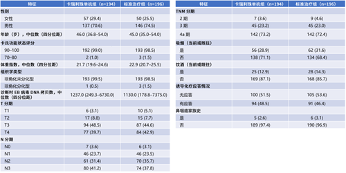 该研究于2020年8月至2022年6月在中国7家医院召开,入组了390例年龄18-70岁、经组织病理学确诊为非角化型鼻咽癌(分化型或未分化型)、Ⅳa期(T4或N3,AJCC第八版)或Ⅱ-Ⅲ期(经诱导化疗后影像学评估为疾病稳定/疾病进展或外周血可检测到EBV-DNA)、KPS≥70分的高危局晚期鼻咽癌患者。患者按照1:1随机分为卡瑞利珠单抗组(194例)和标准治疗组(196例)。
